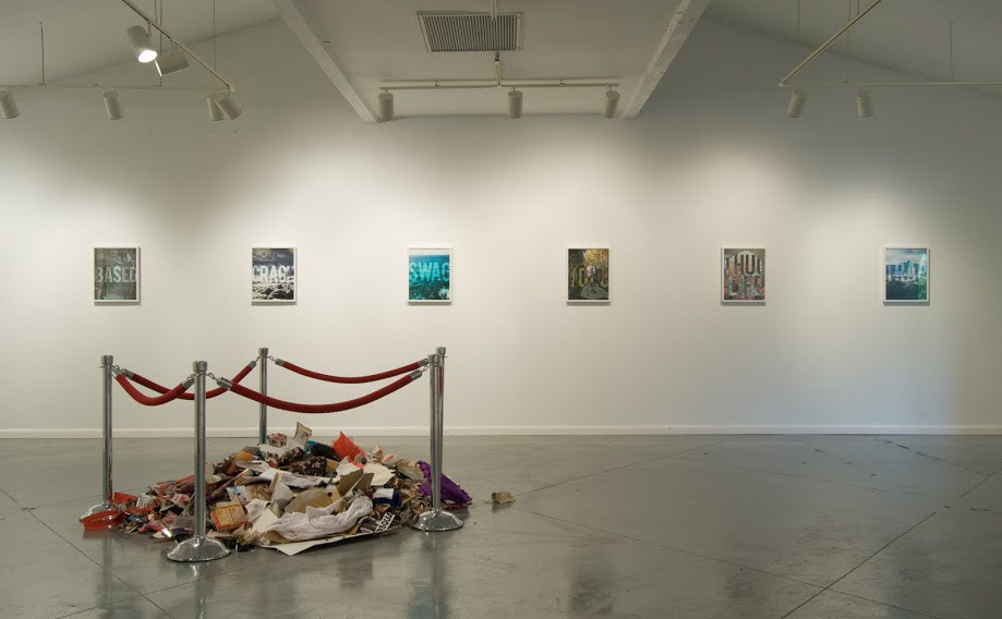 Pyle’s employment of word and images is nothing new. His version weds words filtered through the hip hop vernacular with images that resonate of both the eternal and the ephemeral. Photographs of clouds, mountains, stretches of ocean, flowers, a snow drift in a forest and an opulent table setting are tattooed with CRACK, TRAP, SWAG,THUG LIFE, BASED and YOLO respectively. The position of the text lends a great deal of force to a certain dependency upon the image. Or does it? In these pieces, there is no common ground given over to language and text. The text had migrated from its natural place below the image, where historically it has supported, named, explain and sometimes decomposed it.
